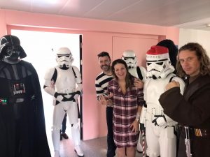 Coincidiendo con el estreno de la última película de la saga este mes de diciembre, la legión 501, también conocida como “Batallón 501” o “El puño de Vader”, junto con algunos más de los protagonistas de “La Guerra de las Galaxias”, han visitado esta mañana el hospital para felicitar las Navidades y el año nuevo a todos los pacientes ingresados. Os dejamos algunas fotos de la visita.